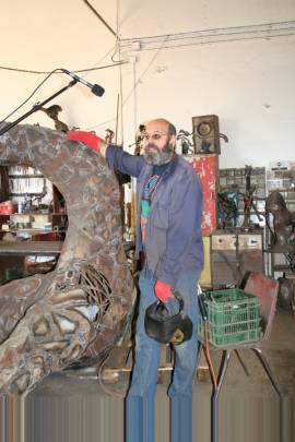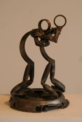 The use of random metal objects and their incorporation in a sculpture can be interpreted as a metaphor of the material. The figure built from a collection of objects that originally performed a function, unlike sculptures crafted from a mass of material, has a dynamic effect on the perception of the viewer. One has to imagine the lines connecting and forming the sculpture as a whole. Gonzales refers to this effect: "It remains for the eye to join together this countless number of points in the infinite" In Assemblage Sculpture the artist actually involves the viewer through his imagination in the completion of the image. He uses the visual memory and the cultural background and associations to actively perceive the artwork. The viewer has simultaneously to cope with seeing the image as a whole and the original objects chosen for the artist's indented meaning. The sculptures that Joop creates are born in his imagination by an idea or clue in the material, and are created by joining and combining metal wires, bearings, bolts , springs, gears , wire nets, etc. Joop's work is inspired by everyday life, by regular people, characters from childhood stories or classical literature, by friends and family members. He is able to identify a dominant characteristic of a person and transfer it to the material. His sculptures express humanity and human qualities, portrayed with humor; their faults or failings are depicted with a smile, understanding and empathy. His work is done spontaneously, working directly with the materials, with no detailed drawing, but concentrating on the specific element that expresses the essence of the figure. The expression of the sculpture is achieved by two main elements: the human gesture and the illusion of movement. It seems that there is an intrinsic contradiction between sculpture and movement. The word itself originates from the Latin word static, referring to the sculpture as an object set in space. Throughout history, sculptors have sought ways to impart to their sculptures the sense of movement. An extreme example is kinetic art that includes moving objects bringing actual movement to the statue. But the artist is in fact searching for the illusion of movement. This illusion can be achieved by various means: for example, by composing sequential rhythmical forms, which may create in our minds the sensation of movement by duplication or by repetition of some detail. Another frequently used technique is the use of other complementary objects, such as pieces of cloth or trees, or other backgrounds that imply movement caused by an imaginary wind. The movement is an illusion induced as the eye picks up successive folds. The illusion is generated when the eye sees the movement in the cloth and perceives it as movement of the object in space. Another way to create movement is through a composition that expresses real movement of the human or animal body, like walking, running, or horse jumping. According to Rodin (1840-1917), the sculpture should show the movement as a process, a gesture that shows the completion of one step and the beginning of the following one. The sense of movement may be enhanced by creating a distortion of the anatomical proportions of the figure's organs. Joop's work combines several elements that create the illusion of movement. The advancement of limbs, their emphasized size, the direction of hair blown by an invisible wind, the position or inclination of the head. Although most of the figures are shown in reduction, the movement is prominent. His work exhibits control and mastery of metal handling, cutting, bending, and welding and soldering; the torch in the hands of the iron sculptor is like the brush in the painter's hand. In the process of working he solves technical problems, in design, balancing the figure, positioning and assembling the parts dealing not only with artistic issues but with safety, especially with large-scale sculptures. His techniques have changed and evolved over the years: At first he created works that may be called two dimensions in three dimensions: works made of metal wires or bicycle chains forming an image from lines in space as a drawing in space, tracing the contour of the image. Lately he has produced a new series with this technique. The need to create large-scale projects, avoiding huge mass and heavy weight, led to the development of a special technique: welding of metal sheets like a patch-work to create the surface around a figure built from an iron frame (Giraffe, Woman Lying). Another group of works is built from cut-out iron sheets, joined in parallel, creating an illusion of depth. (Bird) This technique, resembling paper cutouts, may suggest some advance towards the abstract, although Joop perceives his work as figurative. Most sculptures are made by combining several techniques. The universality of Joop De Jong's works is derived from his personal background: born in Holland and educated in European cultural institutions. His studies in these various environments gave him a unique insight and appreciation of the basic values and simplicity of life. Joop is a creative artist in various media: painting, writing and sculpture At the foothills of the Bental mountain, in the communal society, he found inspiration and meaning and the inner peace needed for artistic creation. The exhibition displays a collection of his sculptures, chosen to show his observations of human nature through human gestures. His humorous and sometimes ironic perspective is apparent, together with the optimistic view inherent to his joy of life. Along with the sculptures we present some of his poems, expressing the artist's contemplations on reality, his moods and loneliness. The poems complement the artworks by revealing a more personal context. Poems and artworks from the exhibition to Joop de Jong Site |