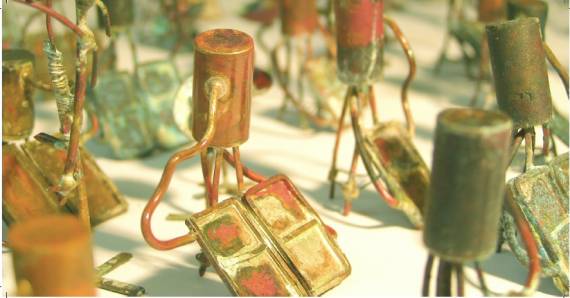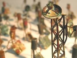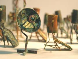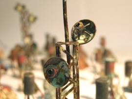 In contemporary art, the boundaries between the various applied arts, design and crafts have become blurred, and the use of various materials in sculpture and installations is an integral part of artistic expression and present-day artworks. Ido Noy uses goldsmith techniques in his artwork. The original goldsmith miniature designs of everyday objects, removed from their context, express our present reality in an original way. Noy is inspired by Tel-Aviv's buildings, observing them with the outsider's fresh point of view. Tel-Aviv, the so called "white city," is revealed as clustered, crowded and dense. The architectural space consists of an agglomeration of elements added over time, unplanned, in a chaotic and incidental process. The piled-up buildings and the objects attached appear to the young artist as ornaments; the electric poles, antennas, air-conditioners, and even garbage bins become decorations. The improvised and unaesthetic symbols of our ongoing hectic life are transformed into an infinite series of miniature artworks. The quantity is of importance, as a metaphor that emphasizes the feeling of the crowded urban space. New buildings are haphazardly added in between old, shabby ones; others receive new facades or elevations, and some are demolished to accommodate new shining towers that reach to the sky. Copper, bronze, brass, silver and gold are carefully crafted, cut and welded, flattened into small delicate objects of art. The detail and the whole in Ido's work provide a new and original perspective of the hundred year-old Tel Aviv. |