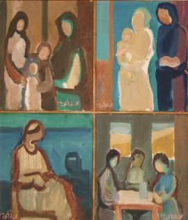 Tal Gallery is honored this present an exhibition of Aaron Giladi and to have the opportunity to encounter his works from the perspective of time in the context of his life events which are representative of many Israeli artists from the second generation of Israeli Art. Artists that came to Israel as pioneers Halutzim worked at all worked needed as laborers builders, farmers, joined the idealistic groups and built the kibbutz society. They performed their art openly or in secrecy, argued arduously about new ways in modern art, the significance of Israeli art, the local vs. the global, the figure versus the abstract, the change in style or hanging on to the personal artistic ways. Giladi was there at the beginning of the new trends in Israeli art, taking a significant part in the foundation of "Ofakim Hadashim" but he left in understanding the deep roots of his inspiration and continued on his own way of total artistic freedom. As he tells us himself in various interviews, his work related to his early memories, a large family living during the war together at his grandfather house, the experience of hardship of young man who was send as a student at the Art academy in Leningrad to prison and then to exile in Siberia, for his Zionist activity, far from his family that he did not get to meet again. He joined the Zionist movement and came to Palestine, was one of the establishers of Kibbutz Afikim in the Jordan Valley. After twenty years he left the kibbutz and moved to the city, finally he settled in Holon, a modest neighborhood where he lived all his life. The Kibbutz people and their everyday life of his early drawings transformed to the city workers, on their way to their daily chores, on buses, on streets or local garden benches, in coffee shops, the anonym faces absorbed in their grimy toils. He gave them a new life on his canvases, but mostly they became the family members clinging together in clusters around the table or standing still as characters of a play. His characteristic style and can be easily recognized from the lines of his early drawings to his late paintings. Quick stokes, oval open lines, partial contours of the image, leaving details to be completed by the viewer imagination. His main body of work is the oil canvases. As he stated, the subject is only an excuse to the painting... He starts with a stain of paint, a splash of color that leads him to the whole composition. The subject changes with the many layers of paint added the image becomes more and more as the memory of the past. Giladi returns in his work to some distant place from his memory, from his inner self. His work is driven by emotion, and his sensitivity reflects through the silent, faceless, sober figures he creates over and over again. There is density and crowdedness in the composition, the figures are flat but some perspective is realized by the crowdedness of the figures, positioned one on another, giving the feeling of no space. The Scenes of people at their rest from the day toil, at the table, playing a chess game or silently enjoying the togetherness. One main theme in Giladi's work is Mother and Child. We do not know if is the influence of because the Christian icons he saw in Russia of his youth, or his studies at Leningrad Academy of Art, or may be the due to dialog with Renaissance artists he carefully studied from the cherished book his mother gave him when he was exiled to Siberia. It may be the longing to his own mother who was a significant figure in his development as an artist, the mother that he left behind as young man in tragic events on the last meeting in the port of Odessa before leaving for the new life in Palestine. I may also be the lost of his first child, as in the early drawings in his mother's arms. It maybe that all gathered in one figure that he returns to over and over in his works. Apparently his work did not change during the year but with a close look from the chronologic perspective we can observe some changes during the years. The last works are more of bright colors, less dense and the figures portrayed with contours like colored drawings. The background is changed, more empty spots, the grid hat was characteristic influenced by the modernist concepts of "Ofakim Hadashim", disappear leaving blank or one colored space. He continued to his work till the last days of his life, his last colorful pastel drawings describe the elderly some in wheel chairs, in their daily routine with a sense of empathy and compassion, as he drew people thought his life. The exhibition shows oil paintings from his lifetime period of creation, some of his early works from the kibbutz period, some from later periods along with a few water color paintings and some of his last pastel works as a man of old age. We show some drawing from the early works, books and leaflets with illustrations. We also bring words written on Giladi's art by Lea Goldberg , David Ben-Gurion, E. Colb, Dr Haim Gamzu, Curator Yona Fisher and Artists friends, like Avigdor Stimatzki. We wish to remind and remember this special artist that is an inseparable part of the chain of Israeli Art. His life story is representative of other artists that made their way to a new country and built a new society, in the kibbutz and in the city, but he remained independent in his artwork. As he himself tells: "The clumsy characters are not of our time, they belong to the days of Genesis, as though standing in their silent revolt for the wrongs done to generations that did not enjoy the echoes in art as by kings and prophets. Their faces express oppressed inner tension, fearing for destiny of mankind, whispering a prayer for infinite truth, like the love of a mother for her son". The works in the exhibition are presented with courtesy of Giladi Family collection, Kibbutz Afikim archive, the artist Jan Rauchwarger, the artist Jacob Gildor, Curator Gabbi Maanit and Tal Gallery collection.Ady Greenfeld Exhibition Curator |