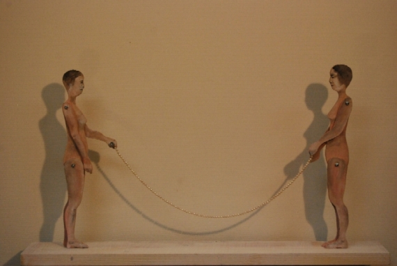 מיקי צדיק – קורמת עור מיקי צדיק מגדלת בין אצבעותיה קרומים בדומה לברווזים. האם זוהי משאלה או כורח מציאות, מדובר בברירה או בגזרת גורל? אין זה עור מגן, כמו זה העוטף את גופנו, הבא לגונן על בשר וכלי-דם מפאת פגיעותם. הקרומים המחברים את האצבעות הנפרדות למשטח בעל יכולות חדשות, מאפשרים לכף-היד - אשר בהעדר הקרומים אולי היה צריך לכנות אותה מזלג היד - למצות את האפשרות הגלומה בשמה. אבל זוהי לא רק כף, האיבר החדש יוכל להדוף מים, כדי להביא להתקדמות, בדומה לסנפירים. בעבודות אחרות הופכים הקרומים למניפות ההודפות אויר. גם המניפות ממוקמות במקומות פתוחים, כביכול ריקים, באזורים שבאופן רגיל איננו מתמקדים בהם. התערוכה, אם כך, מזמינה את הצופה לבדוק את אלמנט הבחירה: מה מושך את עינינו, את מחשבותינו, ול?מה נשים-לב. האם אל האלמנטים או אל המרווחים ביניהם? ועוד, האם נבחר למשוך בחבל המשתלשל מן המריונטה כדי להפעיל את המניפה שבין רגליה הנפשקות של הדמות? עם מה אנחנו משתפים פעולה במקרה כזה? האם נדמיין את גופנו מצמיח קרומים, והיכן? אבל התערוכה גם מרחיקה אל מחלקת האביזרים. כאן ניתן לנו לבחור במחרוזות. המחרוזת התלויה על מתקן אולי גם היא סוג של קרום, או לחליפין אביזר מאיים. ומתקני המחרוזת מסייעים בקישוט העור. הנשים האלה עונדות, רק כאילו, את המחרוזת. והרי היא נשארת תלויה, ואינה כרוכה על צווארן. אין כאן חבל תליה אבל גם לא תוספת לבוש נעימה ומנחמת כגון צעיף או שאל. האביזר נותר אבי-זר, אבי כל הזרות. הוא אינו הופך לחלק מהגוף, אינו צומח באופן אורגני – רחוק מכך. גם המחרוזת הנעה בין שתי נערות בעלות עור שקוף, אינה תכשיט של אף אחת מהן. המחרוזת מפנה את מבטנו לעבר מה שקורה בין שתיהן. מעמדה חדש: היא אינה בשר מבשרן, היא אפילו לא מתחזה לעור, ובכל זאת, יש לה תפקיד ומשמעות. אם קרומי הידיים או המניפה שבין הרגליים ובחלל הפה מצויים בתחום של בין אדם לעצמו, הרי שהמחרוזת הזאת הינה הקרום הקושר אישה לרעותה: רגיש ומועד להיקרע, ועם זאת גמיש ומאפשר תנועה. כאדם הנע בתוך התערוכה, אני חשה, שבמימד של הגוף היא קורמת עור, ובמגע העמוק עם תכני הרגש והנפש, היא עושה דבר מאחד אחר. ואולי ניתן לשחק קצת באותיות ובמילים ולומר, שבמובן מסוים, היא רוקמת אור. שרה שילה |