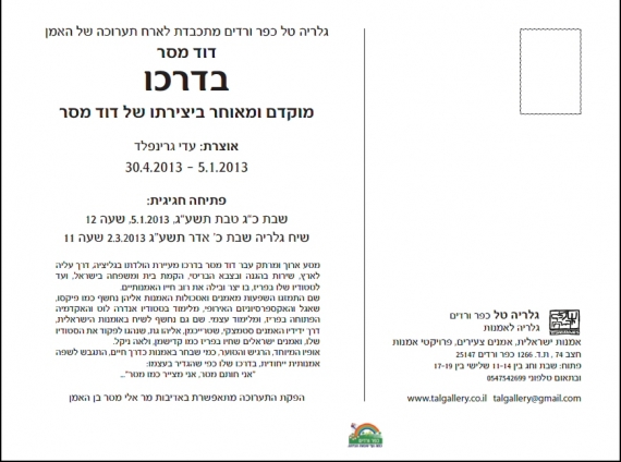 דוד מסר בדרכו מסע ארוך ומרתק עבר דוד מסר בדרכו מעיירת הולדתו בגליציה, דרך עליה לארץ, שירות בהגנה ובצבא הבריטי, הקמת בית ומשפחה בישראל, ועד לסטודיו שלו בפריז, בו יצר ובילה את רוב חייו האמנותיים. שם התמזגו השפעות מאמנים ואסכולות האמנות אליהן נחשף כמו פיקסו, שאגל והאקספרסיוניזם האירופי, מלימוד בסטודיו אנדרה לוט והאקדמיה הפתוחה בפריז, ומלימוד עצמי. שם גם נחשף לשיח באומנות הישראלית, דרך ידידיו האמנים סטמצקי, שטרייכמן, אליהו גת, שנהגו לפקוד את הסטודיו שלו, ואמנים ישראלים שחיו בפריז כמו קדישמן, ולאה ניקל. אופיו המיוחד, הרגיש והסוער, כמי שבחר באמנות כדרך חיים, התגבש לשפה אמנותית ייחודית, בדרכו שלו כפי שהגדיר בעצמו: " אני חותם מסר, אני מצייר כמו מסר"... אלי מסר על אביו אתר דוד מסר |