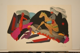 The series of collages made out of mixed media of paper date from her final years, 1968 to 1969, and address new issues such as the Bible, Jerusalem, and the notions of Time and Fate. The combinations of pieces of paper, cut out and glued into new shapes, are reminiscent of the stained glass windows found in Medieval and Renaissance churches. Like the stained glass made of various materials and parts, glass and steel, assembled to create an entirely new entity, these paper collage works, with the addition of a few water color lines, result in a whole new composition. Some of the collages are constructed in an elongated rectangular shape topped with a round curve, reminding of the shape of church windows. |